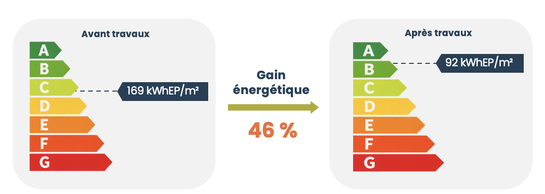 - Conso moyenne : 169 kWh/m².an